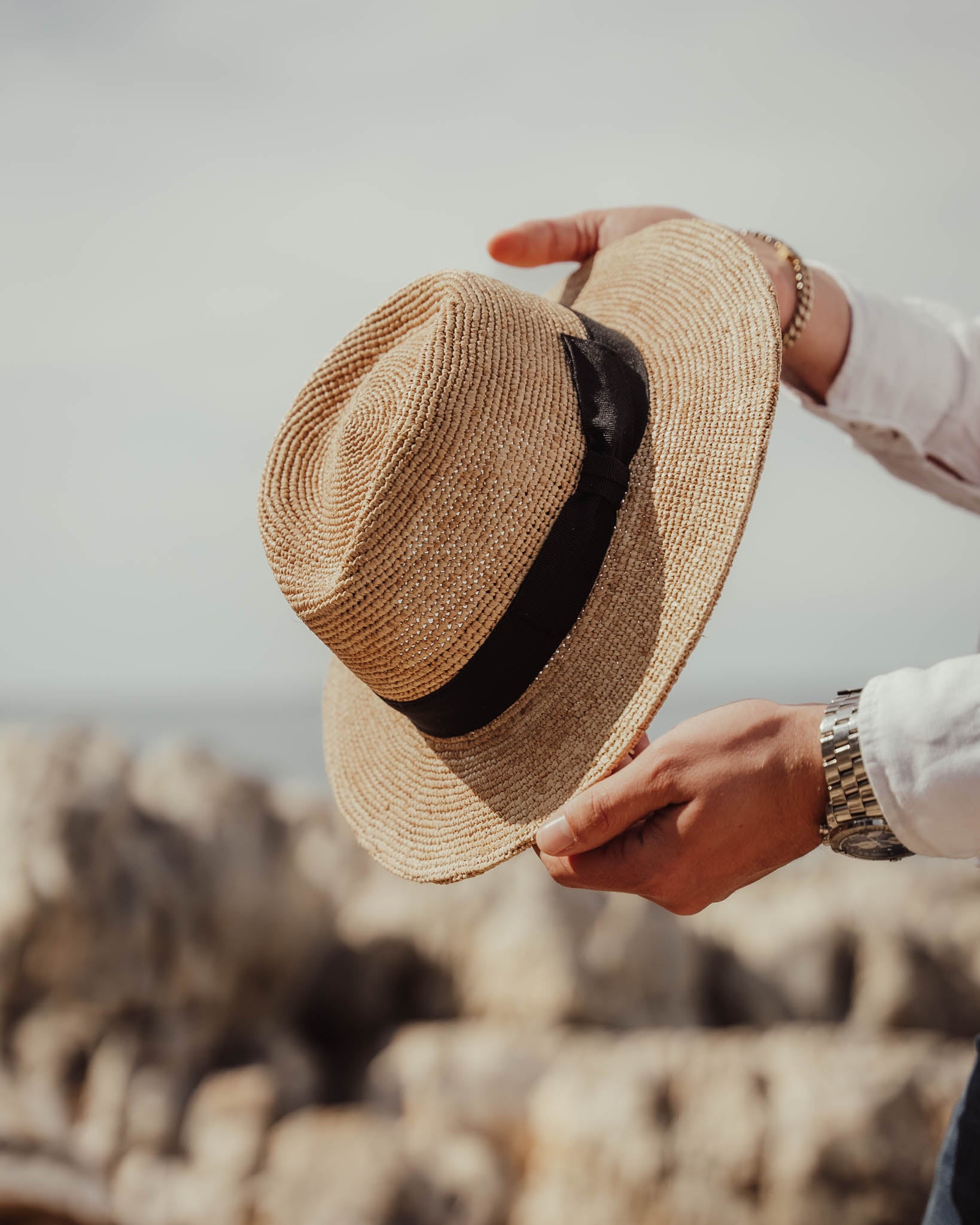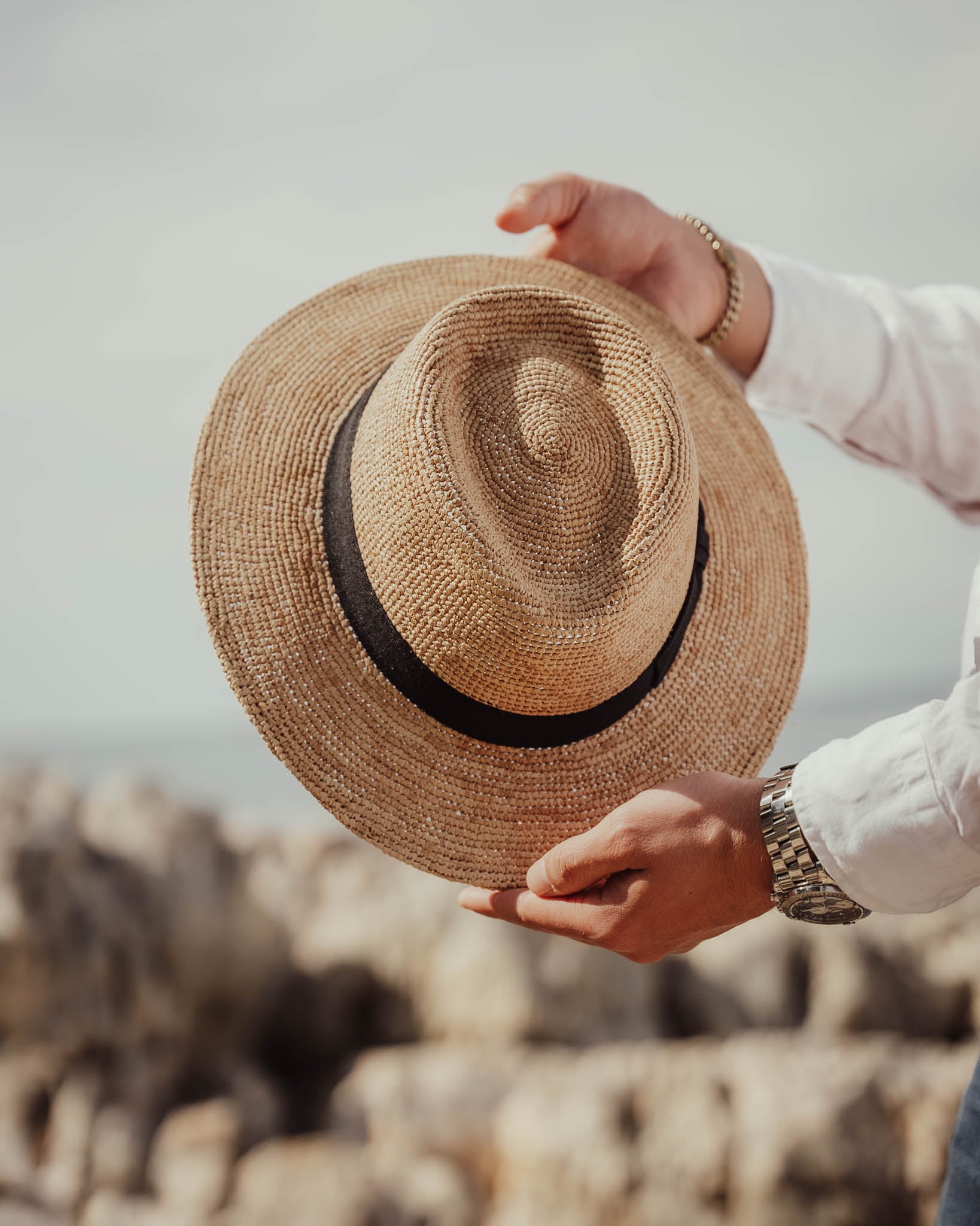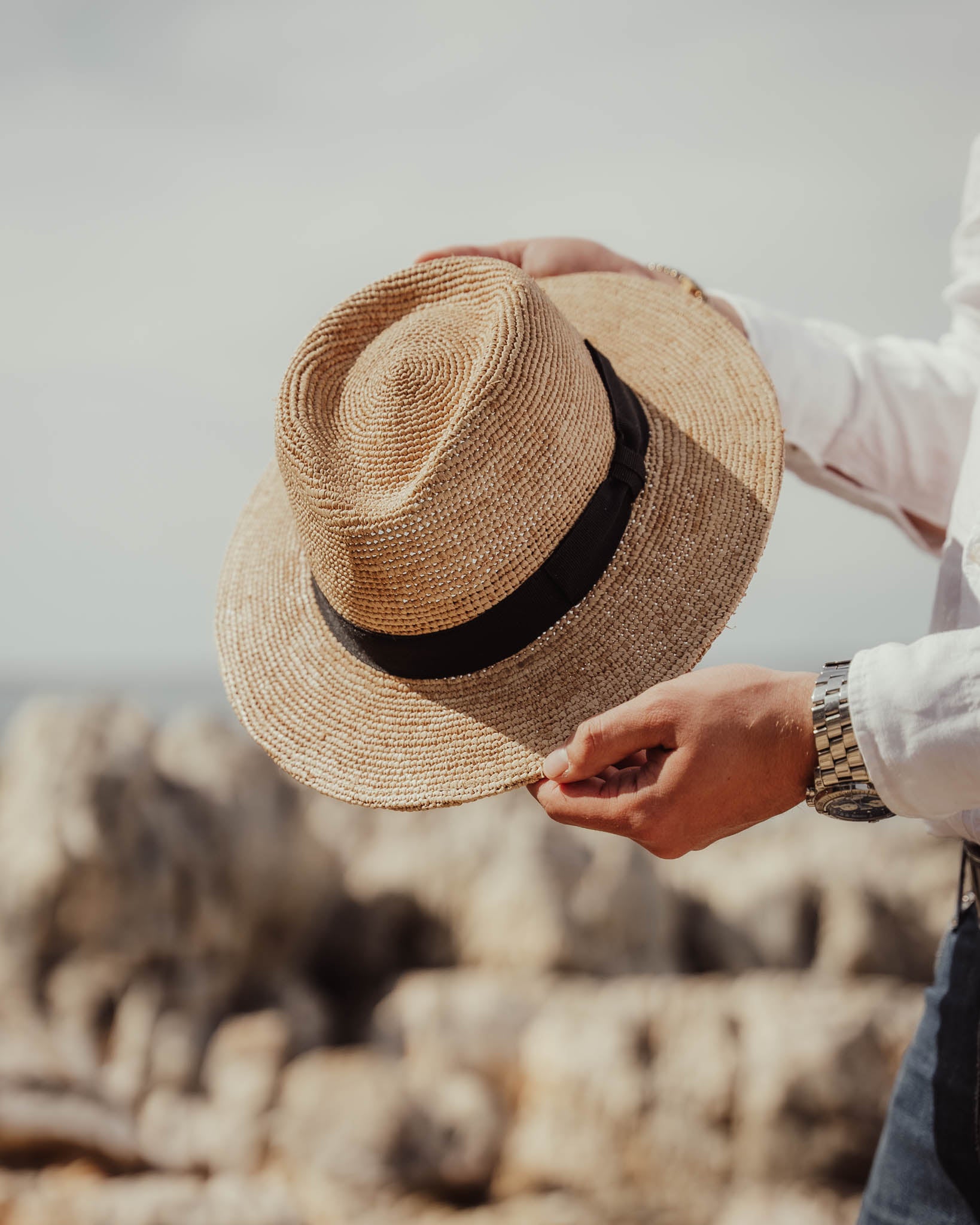 Unser Fedora Strohhut aus Raffia ist ein richtiger Hingucker und passt perfekt zu deinem eleganten, sommerlichen Outfit.