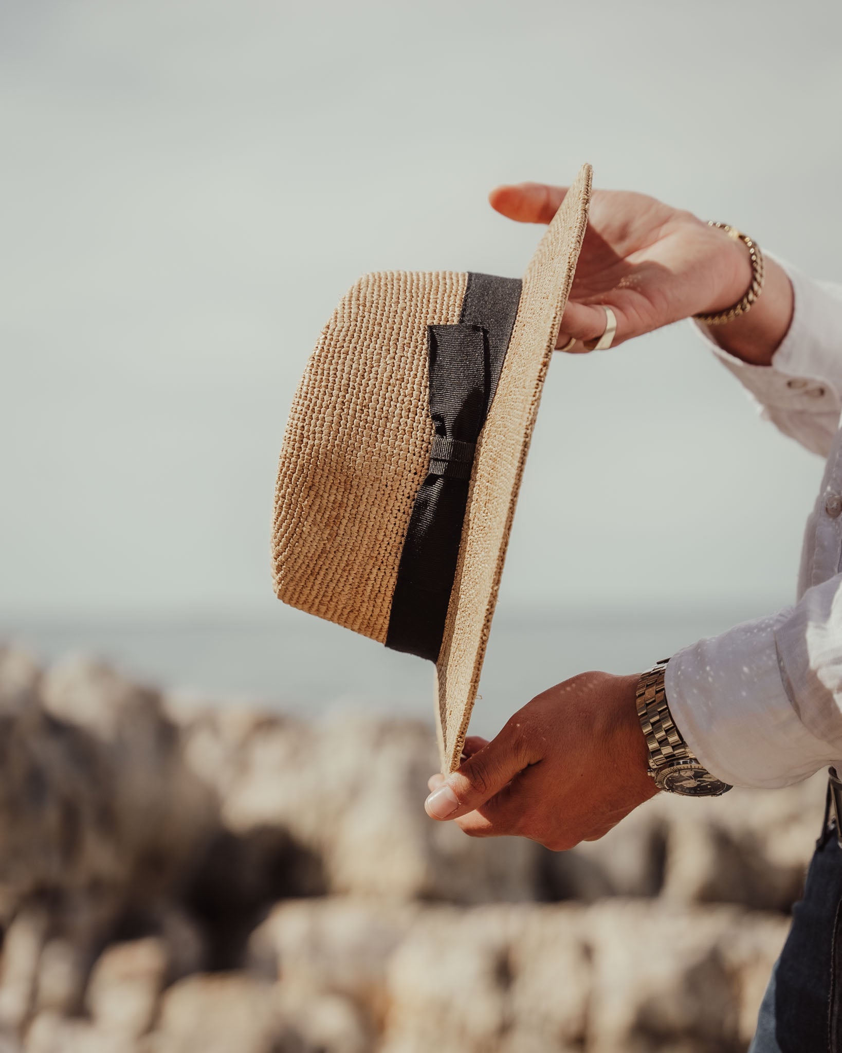 Den Hut nie übermäßiger Nässe aussetzen, um Schimmelbildung und das Aufquellen des Strohs zu vermeiden. Das innenliegende Schweißband mit kaltem Wasser sanft reinigen.